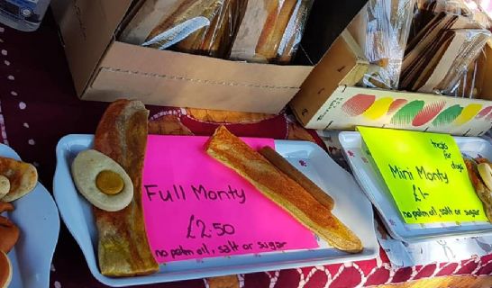 Bacon baps, crepes, toasties hot and cold drinks.